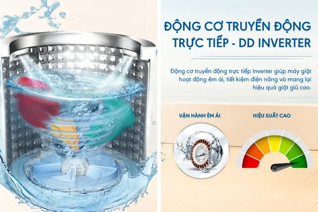 Động cơ Inverter sẽ trực tiếp truyền lực lên giúp lồng giặt quay ổn định và êm ái hơn so với máy giặt truyền động gián tiếp. Ngoài ra, công nghệ này còn giúp máy giặt tiết kiệm điện năng hơn, do động cơ Inverter có thể điều chỉnh tốc độ quay của lồng giặt phù hợp với lượng quần áo và chế độ giặt.